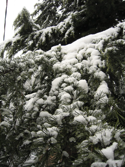 ![]() Freshly falling snow Green spikes resist white blanket Quiet peace descends | |||