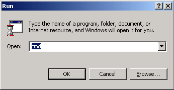 Figure 1 - Run Dialogue for Windows NT/2000/XP In this dialogue, type "cmd", and press "OK". A command prompt should then be displayed. |