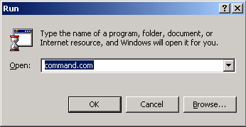 Figure 1 - Run Dialogue for Windows 95/98 In this dialogue, type "command.com", and press "OK". A command prompt should then be displayed. |